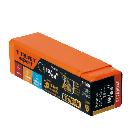 Broca HSS 19/64' Trugold para metal, Truper Expert Caja con 5, 11140
