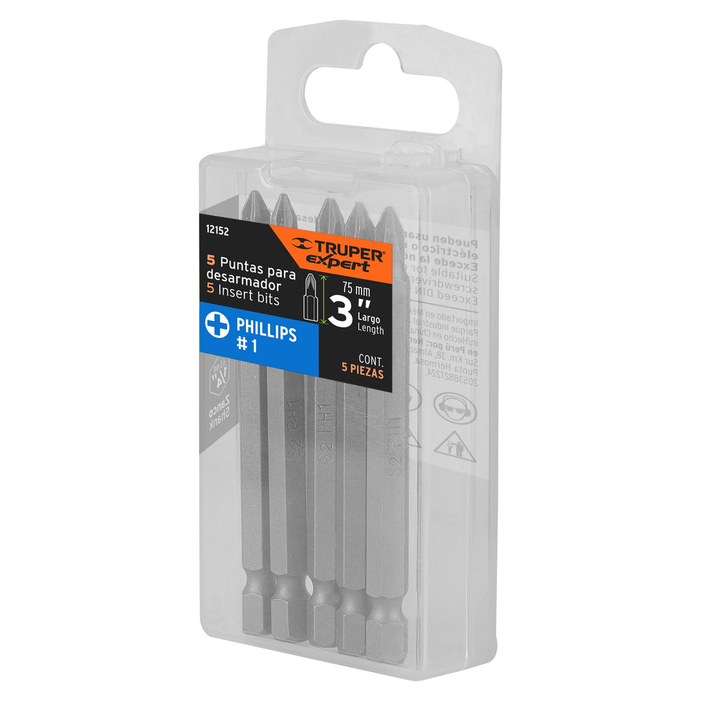 Estuche con 5 puntas de cruz PH1 largo 3', Truper Expert Caja con 6, 12152