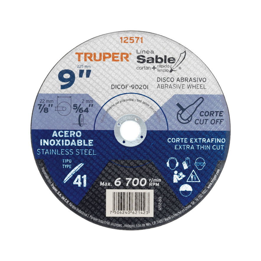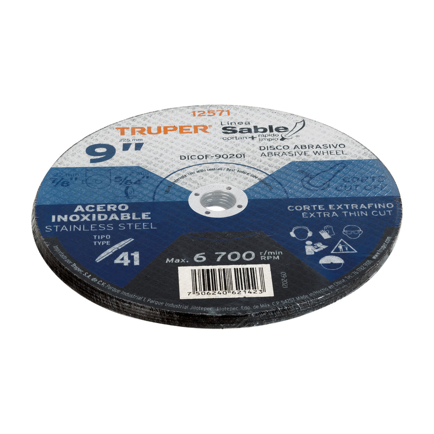 Disco Tipo 41 de 9' x 2 mm corte fino acero inox, Sable Caja con 5, 12571Disco Tipo 41 de 9' x 2 mm corte fino acero inox, Sable Caja con 5, 12571