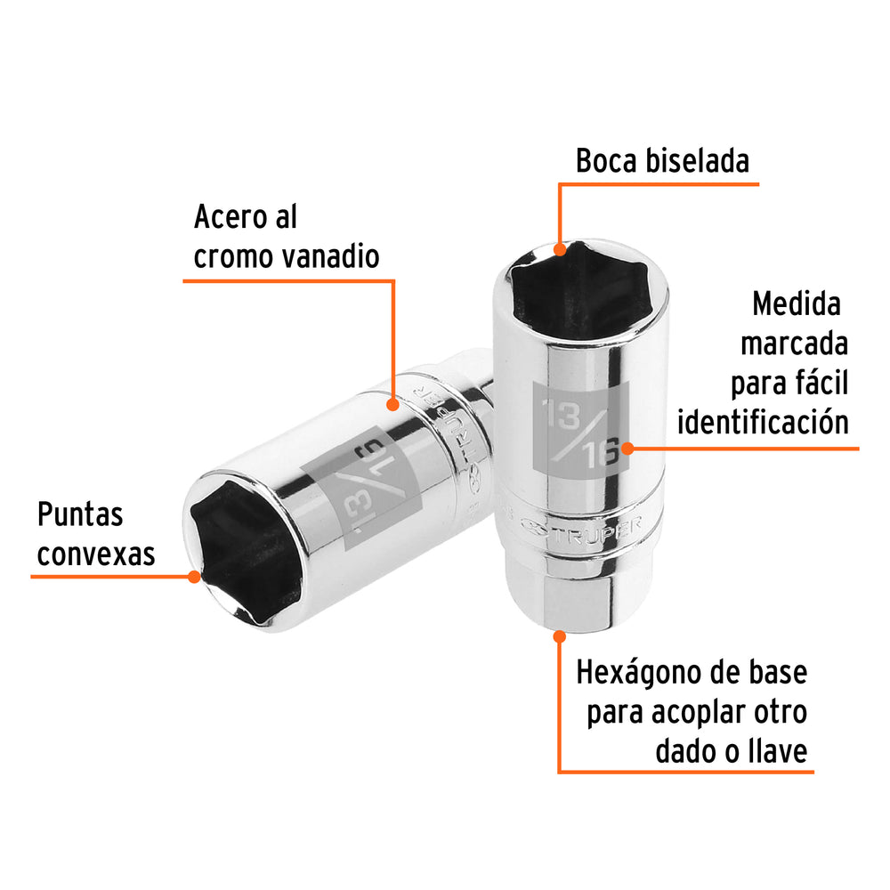 - Sistema de sujeción Truper-Drive con puntas convexas que aseguran y aumentan el torque sin dañar tuercas ni cabezas de tornillos