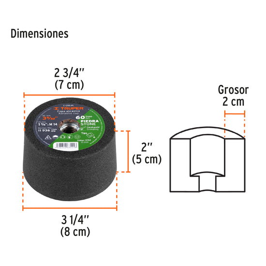 Copa desbaste de piedra 3-5/32' grano 60, eje M14, Truper, 13784Copa desbaste de piedra 3-5/32' grano 60, eje M14, Truper, 13784