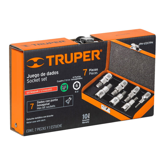 Juego de 7 dados cuadro 1/2' punta hex std, estuche metálico, 13929