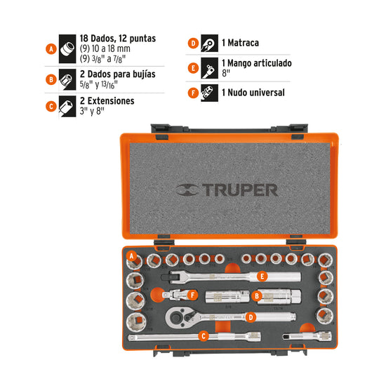 Juego de 25 herramientas cuadro 3/8' std y mm para mecánico, 13954