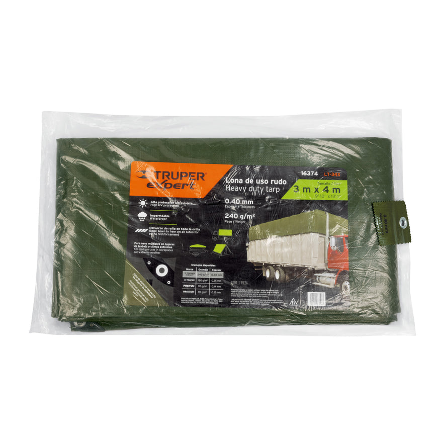 Lona uso rudo, verde olivo, 3 x 4 m, Truper Expert Caja con 2, 16374