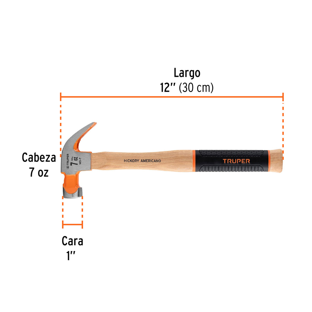 Martillo pulido 7 oz uña curva, mango hickory, Truper Grip Caja con 4, 16650