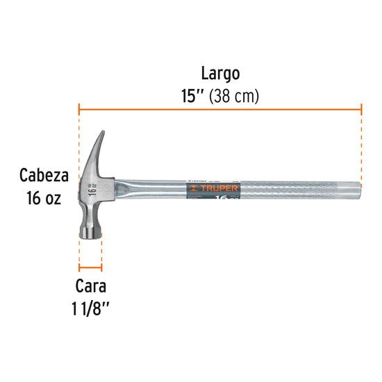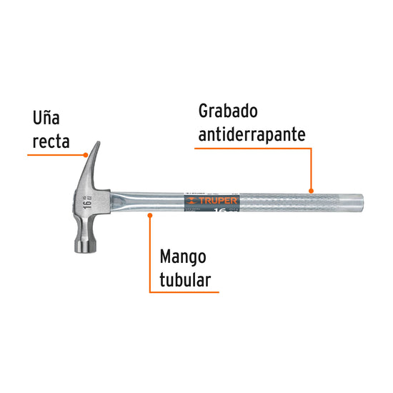 Martillo tubular pulido 16 oz uña recta, Truper Caja con 4, 16702