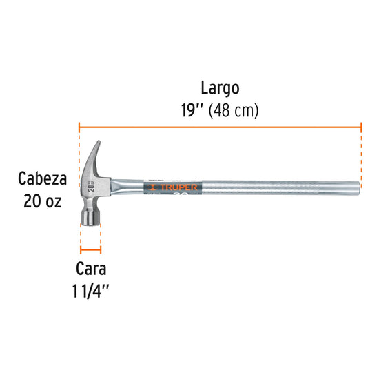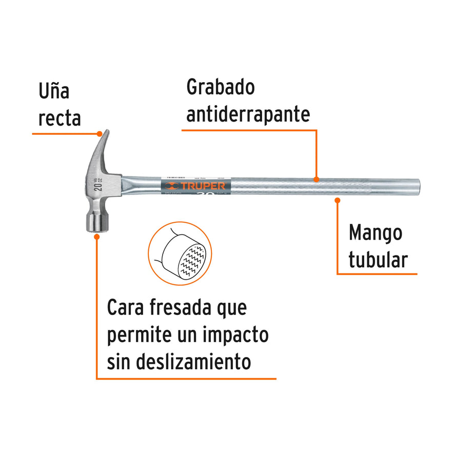 Martillo tubular pulido 20oz cara fresada, uña recta, Truper Caja con 4, 16704