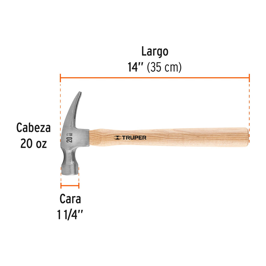 Martillo pulido, 20 oz, uña curva, mango madera, TRUPER Caja con 6, 16753
