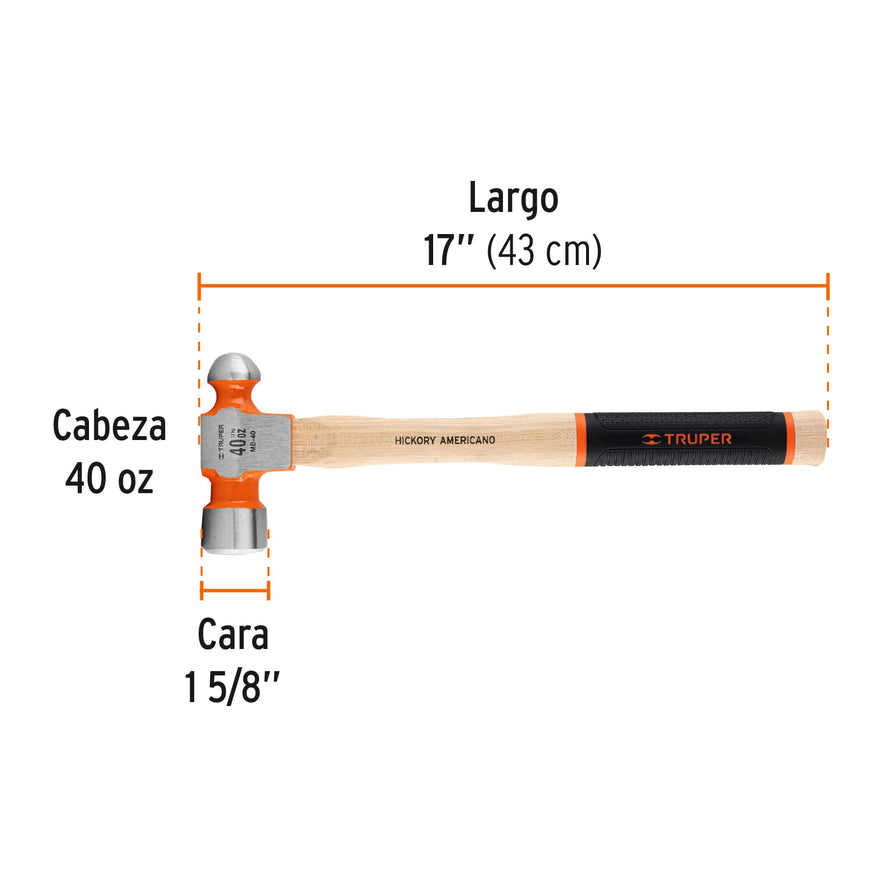 Martillo pulido de bola 40 oz mango hickory, Truper Grip Caja con 4, 16905