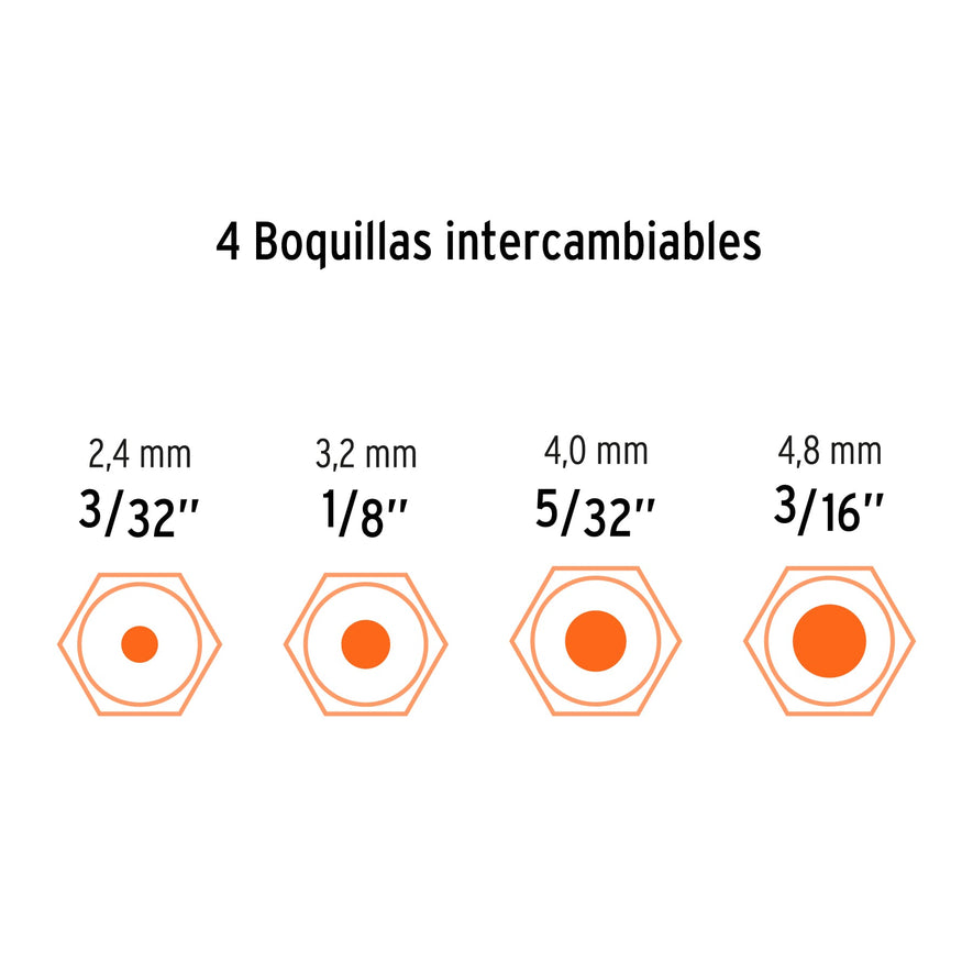 4 boquillas de cambio rápido sin necesidad de herramienta para remaches de 3/32", 1/8", 5/32" y 3/16"