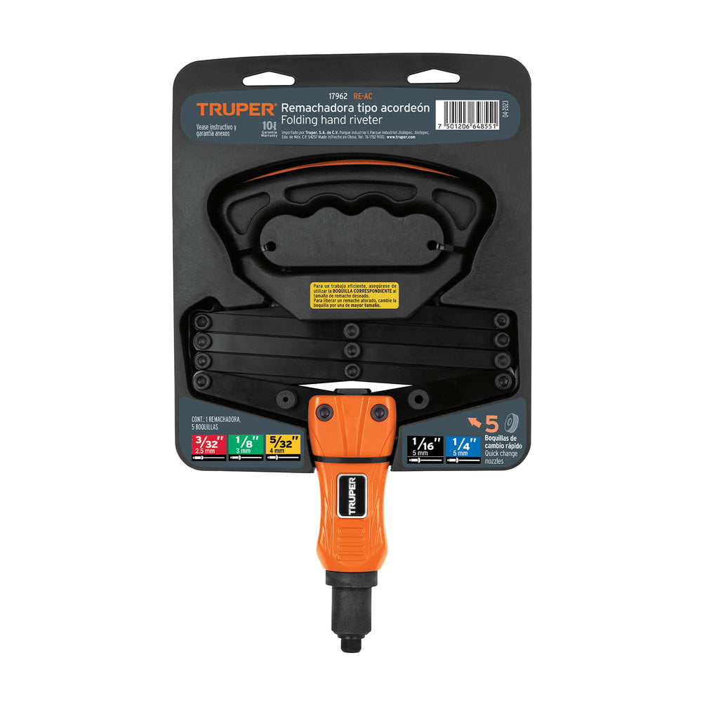 5 boquillas intercambiables con indicador de color para fácil identificación de remaches: 3/32", 1/8", 5/32", 3/16" y 1/4"