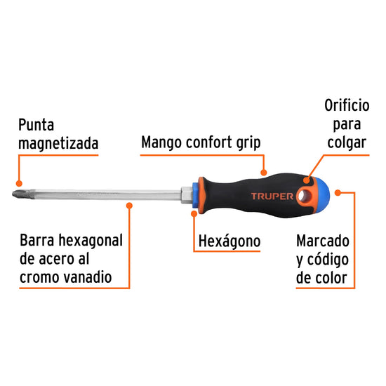 Desarmador de cruz 5/16' x 6' mango Comfort Grip, Truper Caja con 6, 18548