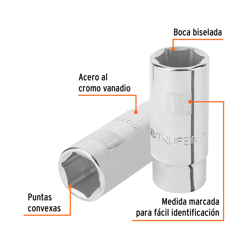 Dado largo de 1-1/16', 6 puntas, cuadro 3/4', Truper Caja con 3, 19344
