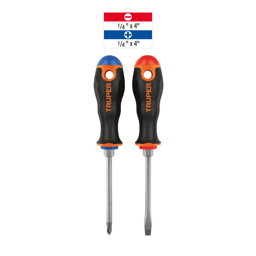 Dúo de desarmadores 1/4' x 4' mango Comfort Grip, Truper Caja con 6, 19622