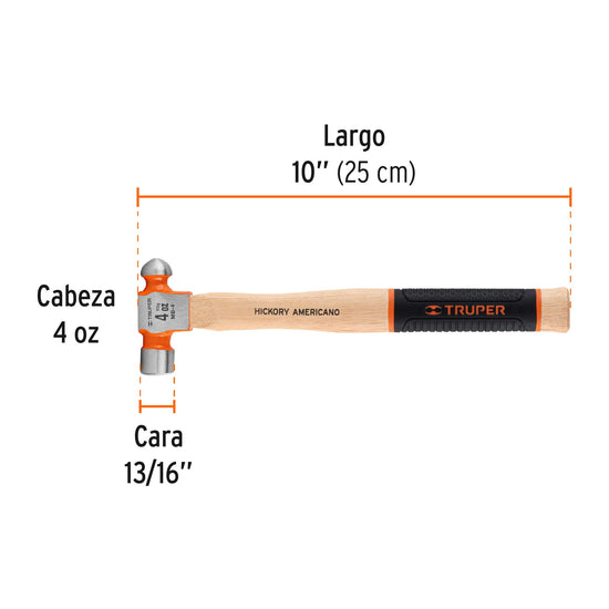 Martillo pulido de bola 4 oz mango hickory, Truper Grip Caja con 4, 19682