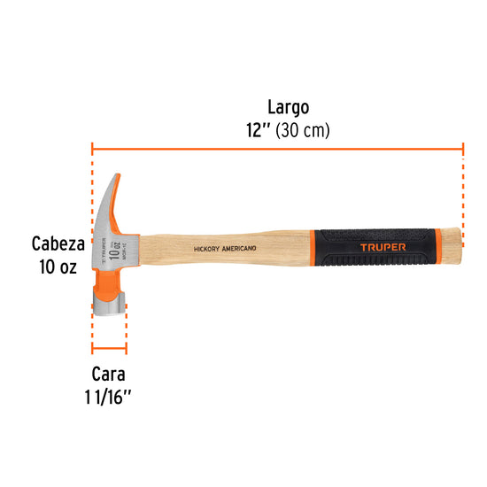 Martillo pulido 10 oz uña recta, mango hickory, Truper Grip Caja con 4, 19711
