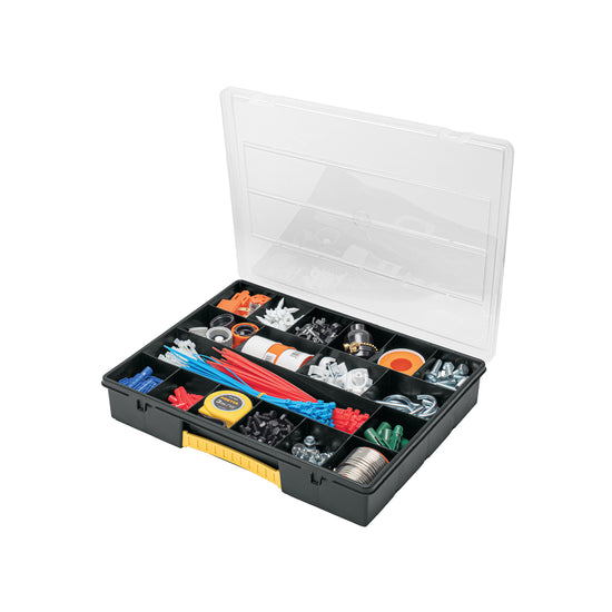 Tapa translúcida que permite ver el contenido y evita que las piezas se muevan a otros compartimentos