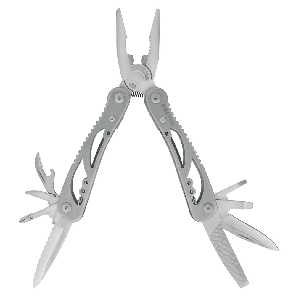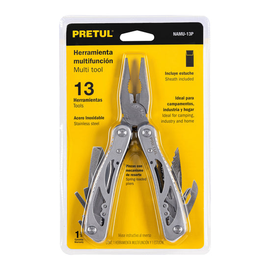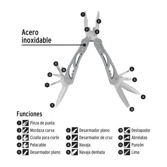 Funciones de pinza de punta, mordaza curva, cizalla para corte, pela cable, 2 desarmadores planos, desarmador de cruz, navaja, navaja dentada, destapador, abrelatas, punzón y lima
