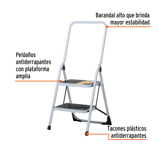 Escalera tubular, plegable, 2 peldaños con barandal, Pretul, 24119