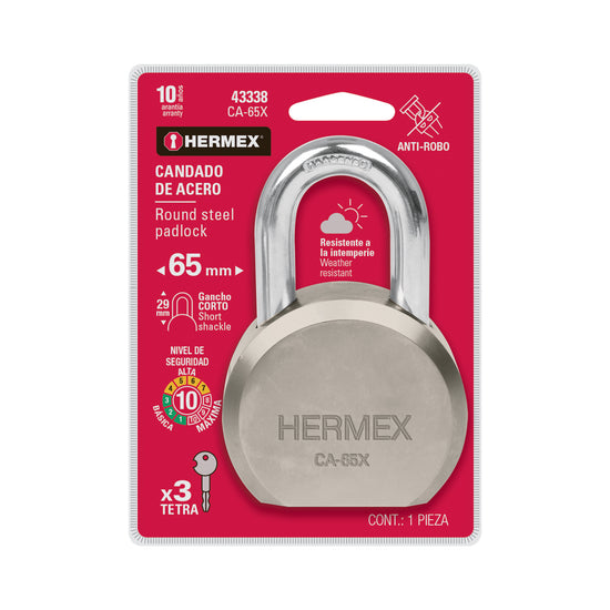 Candado redondo, 65mm, gancho corto, llave tetra, blister Caja con 3, 43338
