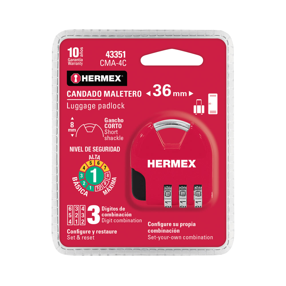 Candado maletero de combinación 36 mm, blíster, Hermex Caja con 6, 43351
