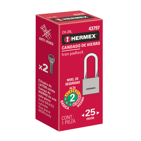 Candado de hierro 25 mm gancho largo en caja, Hermex Caja con 6, 43797