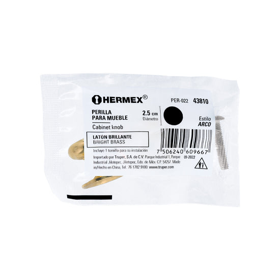 Perilla metálica estilo 'Arco', latón brillante, Hermex Caja con 12, 43810