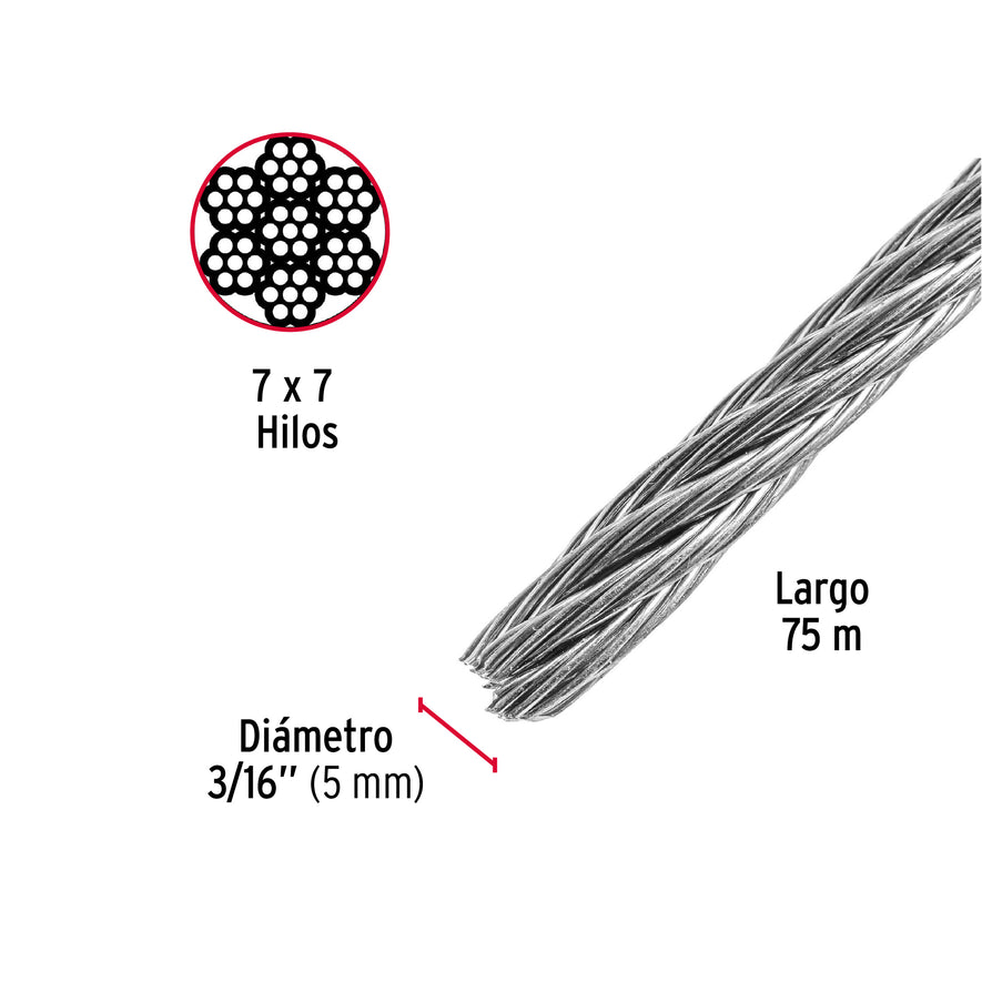 Metro de cable rígido 3/16' de acero 7x7 hilos, 75 m, Fiero Caja con 75, 44206Metro de cable rígido 3/16' de acero 7x7 hilos, 75 m, Fiero Caja con 75, 44206Metro de cable rígido 3/16' de acero 7x7 hilos, 75 m, Fiero Caja con 75, 44206