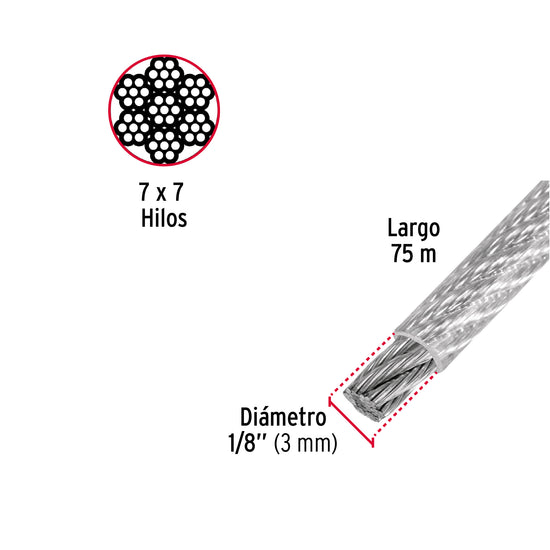 Metro de cable rígido 1/8' acero 7x7 recubierto PVC, 75 m Caja con 75, 44219Metro de cable rígido 1/8' acero 7x7 recubierto PVC, 75 m Caja con 75, 44219Metro de cable rígido 1/8' acero 7x7 recubierto PVC, 75 m Caja con 75, 44219