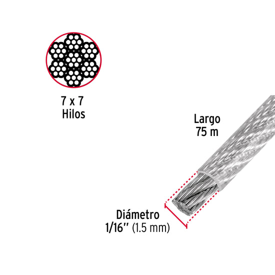 Metro de cable rígido 1/16' acero 7x7 recubierto PVC, 75 m Caja con 75, 44220Metro de cable rígido 1/16' acero 7x7 recubierto PVC, 75 m Caja con 75, 44220Metro de cable rígido 1/16' acero 7x7 recubierto PVC, 75 m Caja con 75, 44220