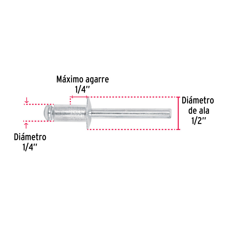 Bolsa con 50 remaches de 1/4' x 1/4' de aluminio, ala 1/2' Caja con 7, 44532