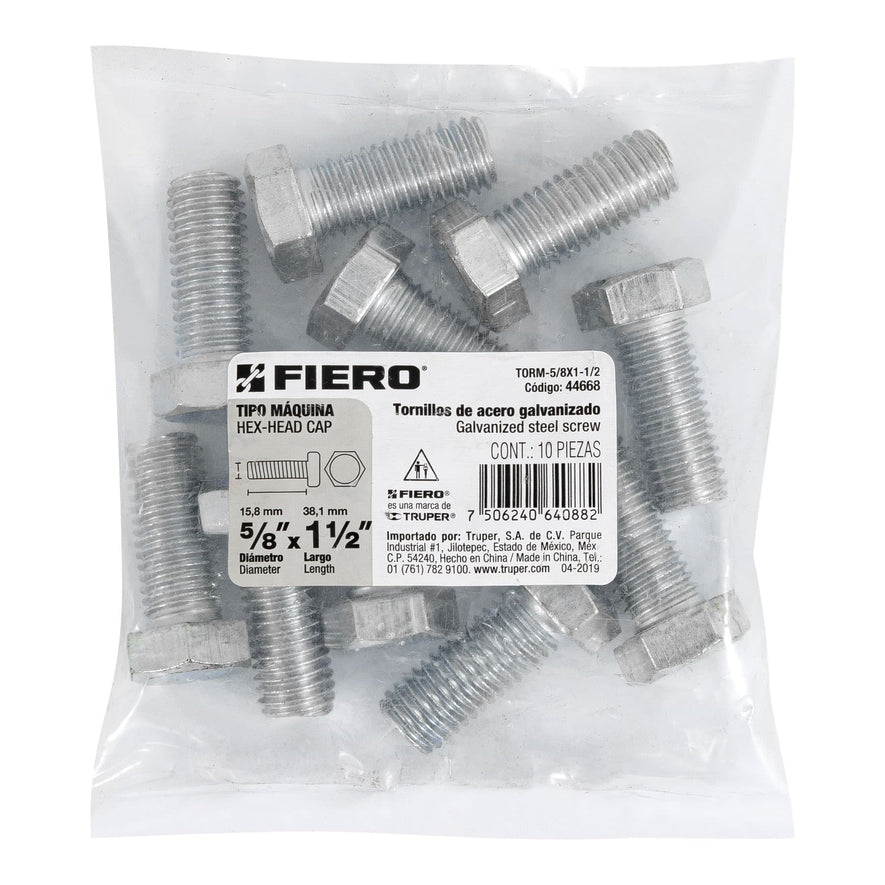 Bolsa con 10 tornillos 5/8' x 1-1/2' tipo máquina, FIERO, 44668Bolsa con 10 tornillos 5/8' x 1-1/2' tipo máquina, FIERO, 44668Bolsa con 10 tornillos 5/8' x 1-1/2' tipo máquina, FIERO, 44668