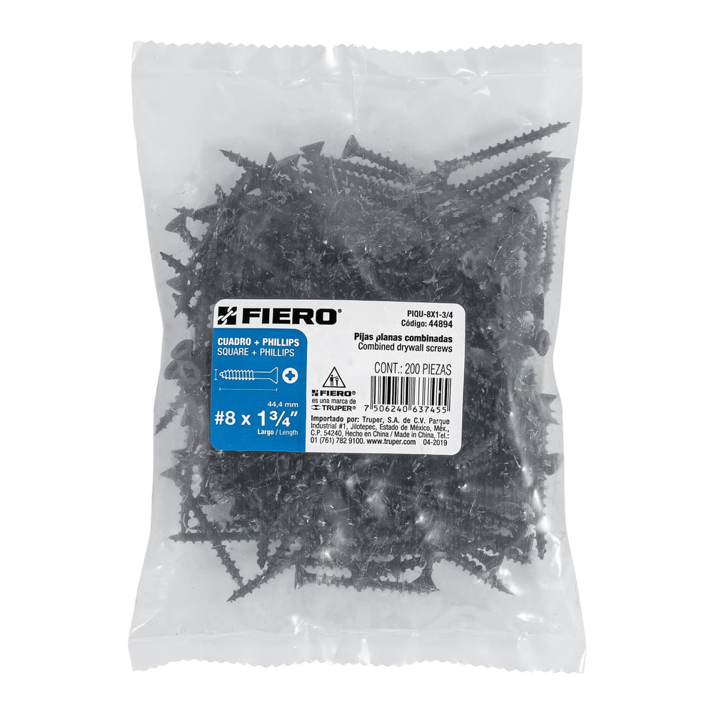 Bolsa con 200 pijas #8 x 1-3/4' combinadas (cuadro+Phillips) Caja con 6, 44894