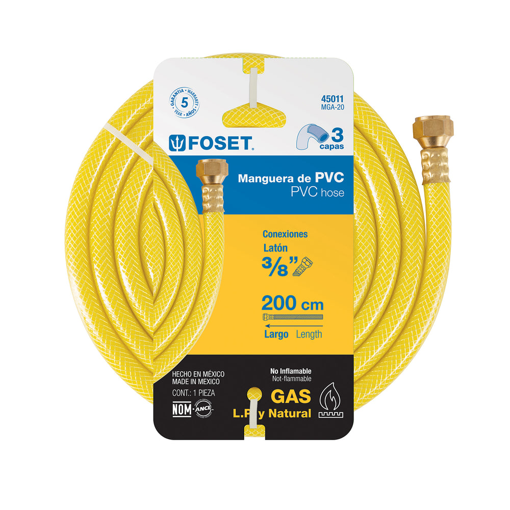 Manguera para gas, PVC amarilla, 3/8'x2 m, c/conexión, Foset Caja con 4, 45011Manguera para gas, PVC amarilla, 3/8'x2 m, c/conexión, Foset Caja con 4, 45011