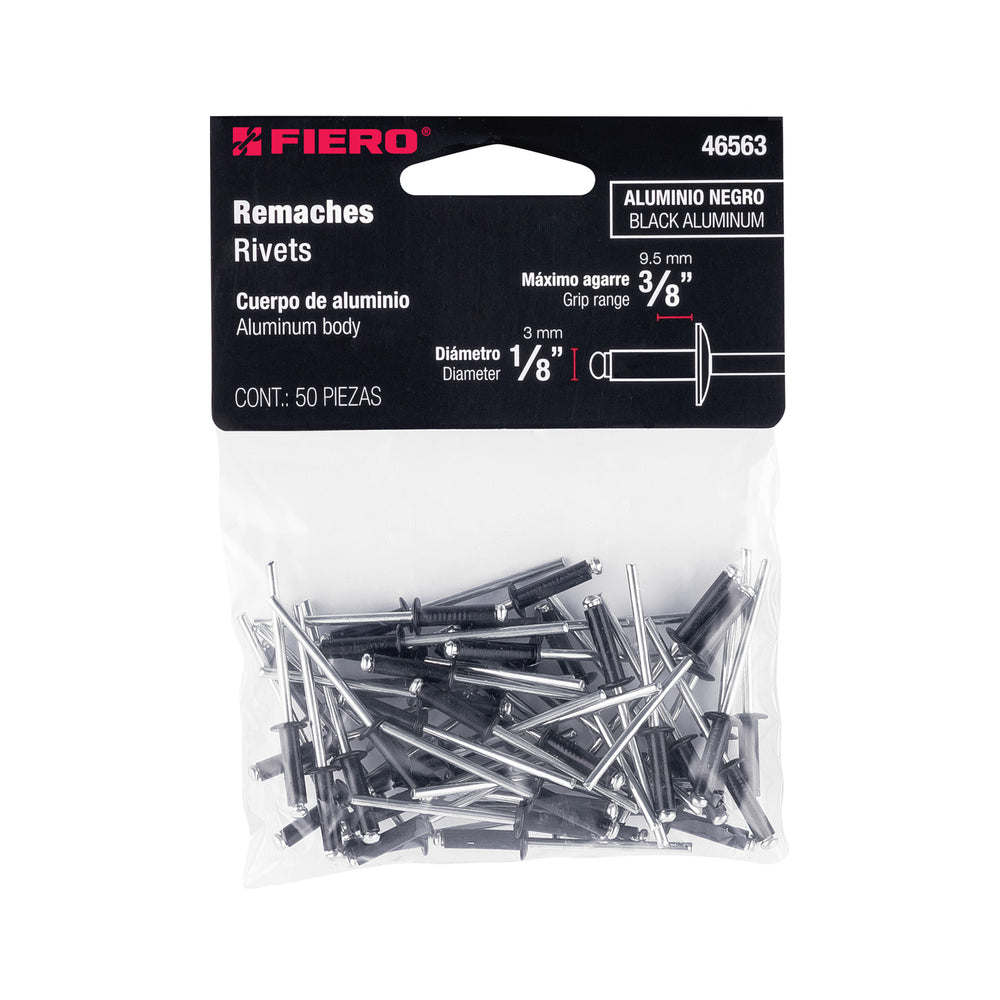 Bolsa c/50 remaches 1/8'x3/8' negros de aluminio, ala 1/4' Caja con 10, 46563
