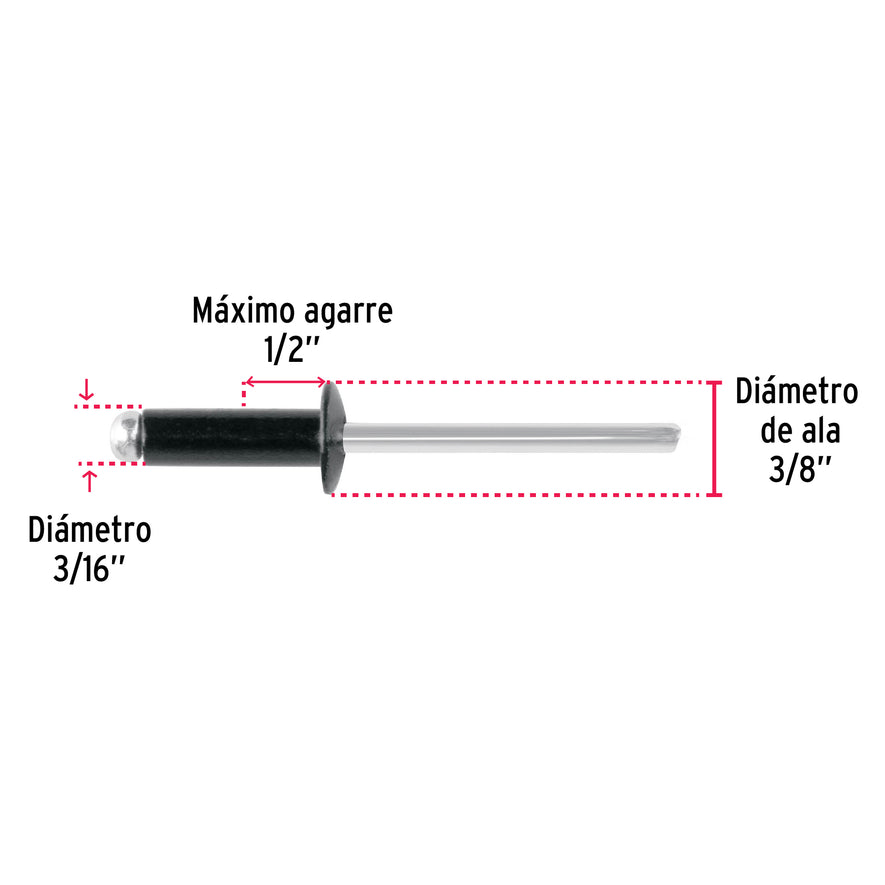 Bolsa c/50 remaches 3/16'x1/2' negros de aluminio, ala 3/8' Caja con 10, 46570