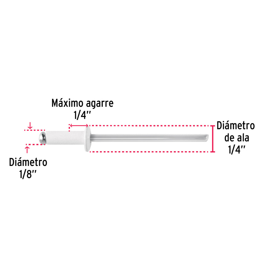 Bolsa c/50 remaches 1/8'x1/4' blancos de aluminio, ala 1/4' Caja con 10, 46571