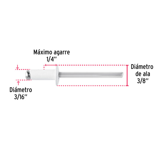 Bolsa c/50 remaches 3/16'x1/4' blancos de aluminio, ala 3/8' Caja con 10, 46578