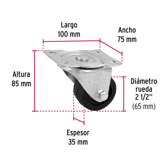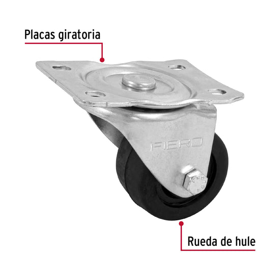 - Rueda de hule con buje y placa de acero con acabado galvanizado
