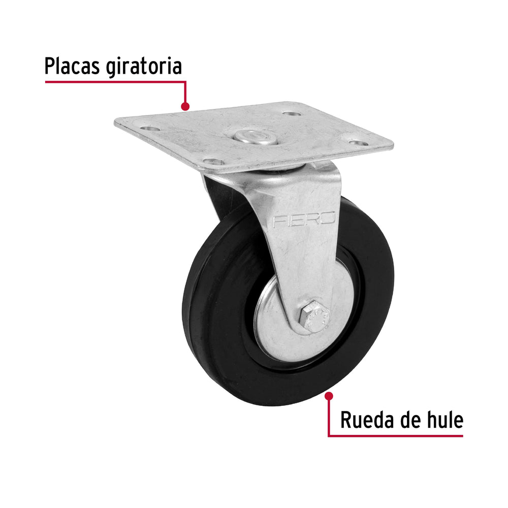 • Rueda de hule con balero y placa de acero con acabado galvanizado
