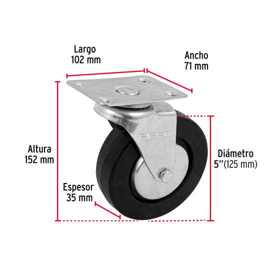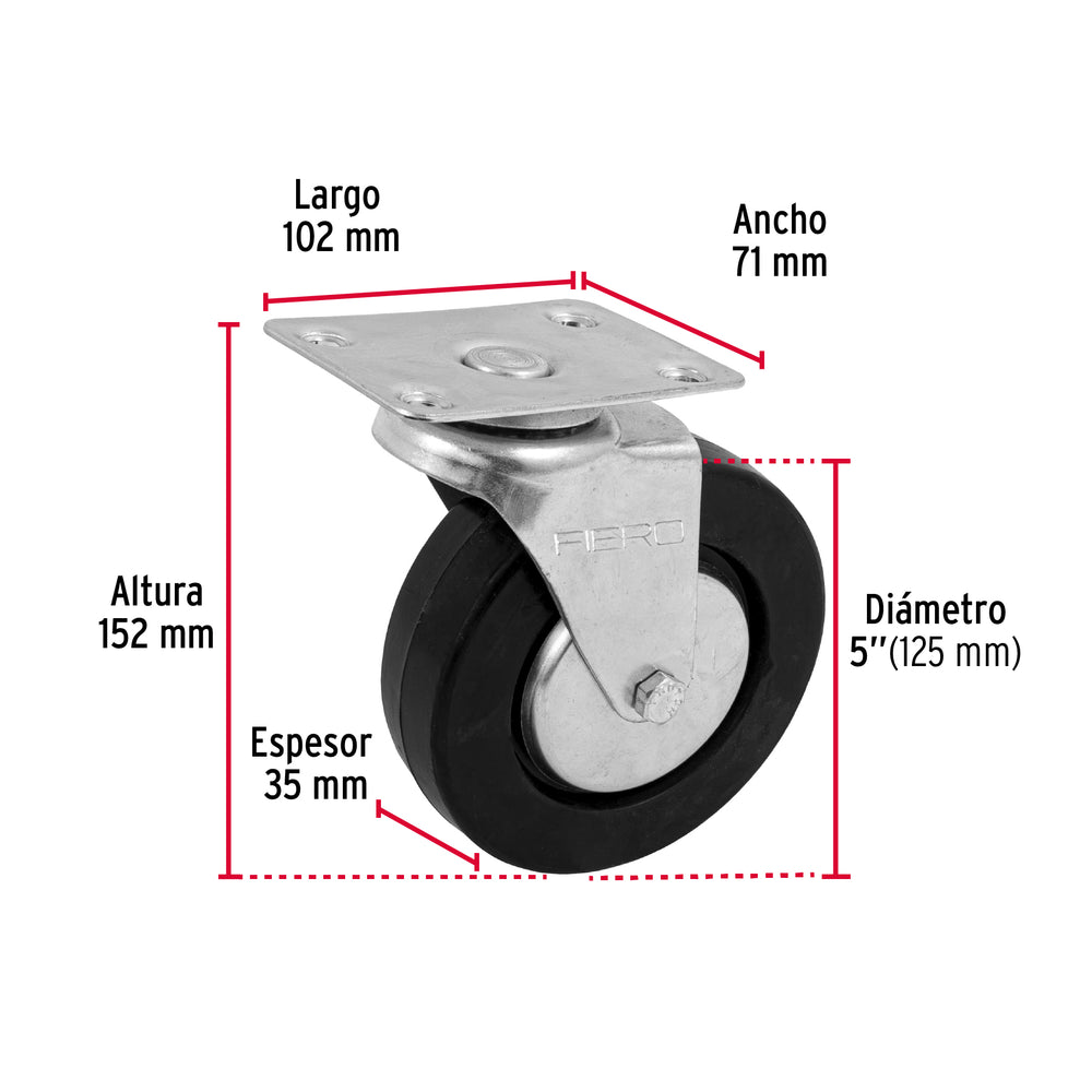 • Rueda de hule con balero y placa de acero con acabado galvanizado