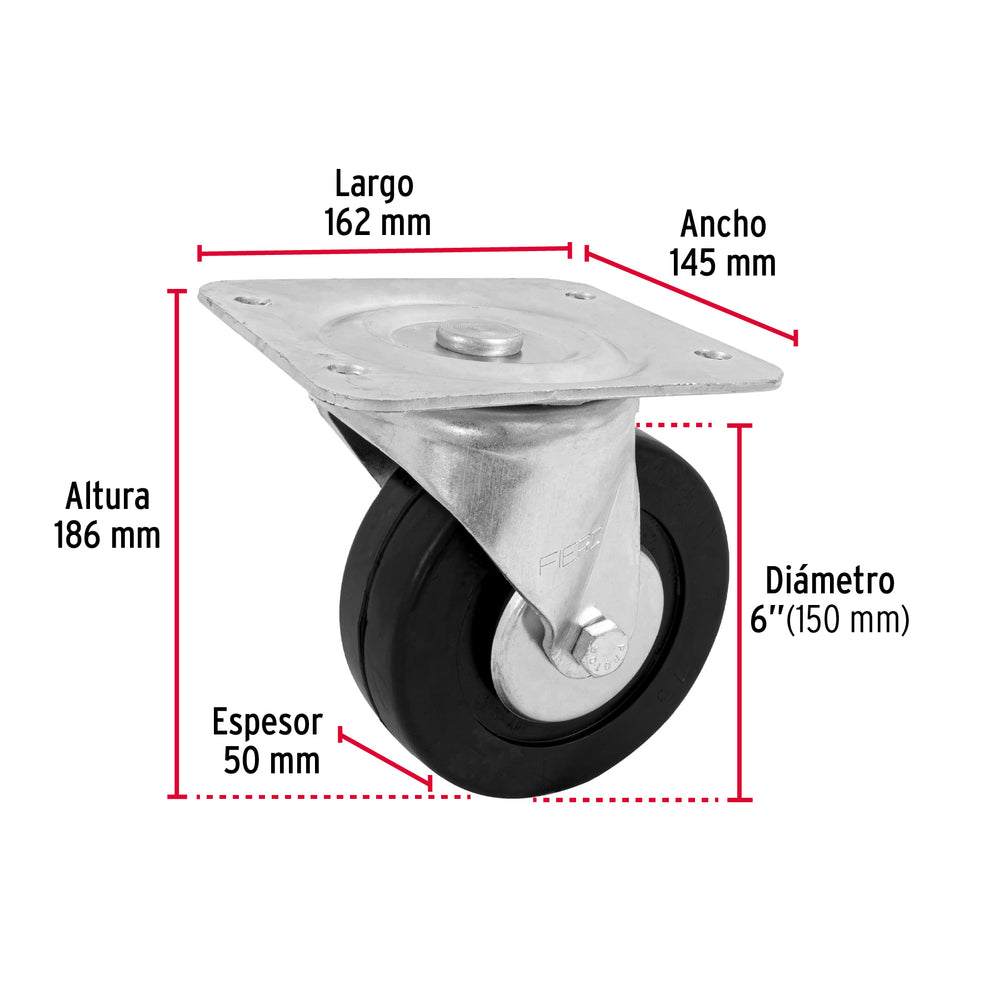 • Rueda de hule con balero y placa de acero con acabado galvanizado