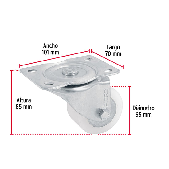 Rodaja de polietileno 2-1/2' placa giratoria, con balero Caja con 6, 48627