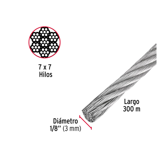 Metro de cable rígido 1/8' de acero 7x7 hilos, 300 m, Fiero Caja con 300, 48797