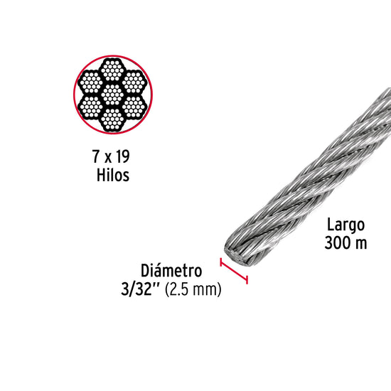 Metro de cable flexible 3/32' de acero 7x19 hilos, 300 m Caja con 300, 48800Metro de cable flexible 3/32' de acero 7x19 hilos, 300 m Caja con 300, 48800Metro de cable flexible 3/32' de acero 7x19 hilos, 300 m Caja con 300, 48800