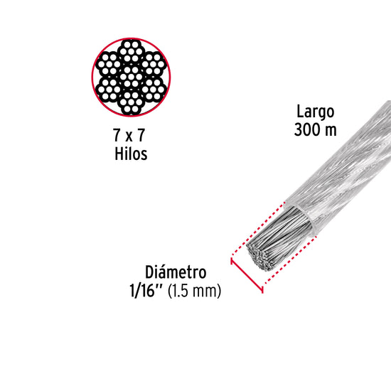 Metro de cable rígido 1/16' acero 7x7 recubierto PVC, 300 m Caja con 300, 48804Metro de cable rígido 1/16' acero 7x7 recubierto PVC, 300 m Caja con 300, 48804Metro de cable rígido 1/16' acero 7x7 recubierto PVC, 300 m Caja con 300, 48804