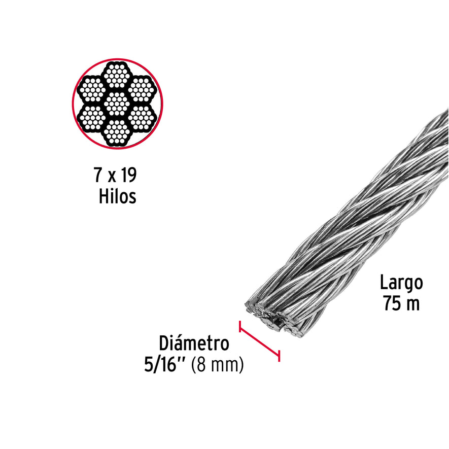 Metro de cable flexible 5/16' de acero 7x19 hilos, 75 m Caja con 75, 48816Metro de cable flexible 5/16' de acero 7x19 hilos, 75 m Caja con 75, 48816Metro de cable flexible 5/16' de acero 7x19 hilos, 75 m Caja con 75, 48816