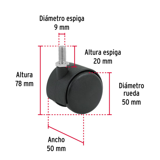 - Rueda de nylon y espiga de acero con acabado galvanizado