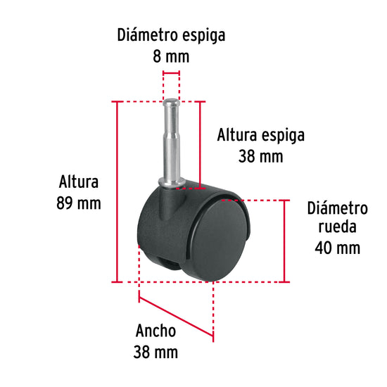 - Rueda de nylon y espiga de acero con acabado galvanizado