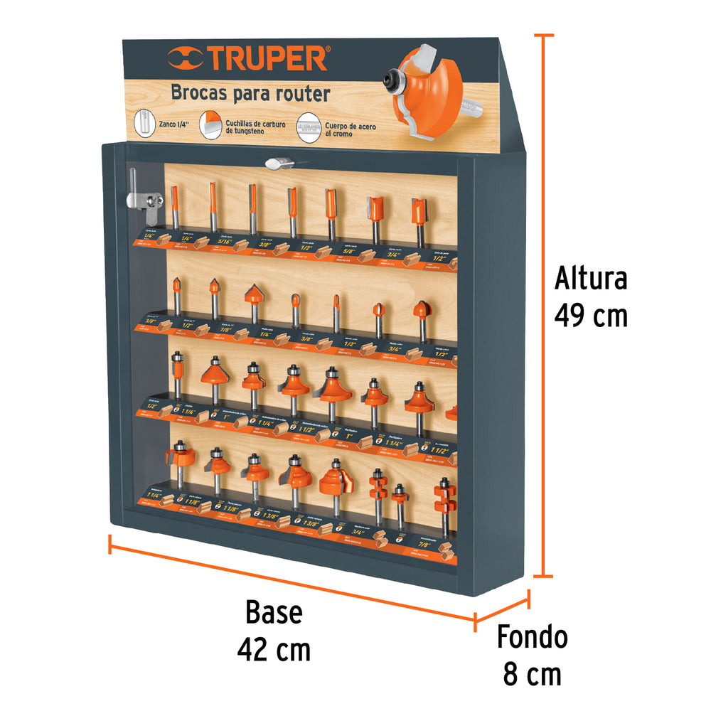 Exhibidor con 30 brocas para router, Truper, 55218Exhibidor con 30 brocas para router, Truper, 55218